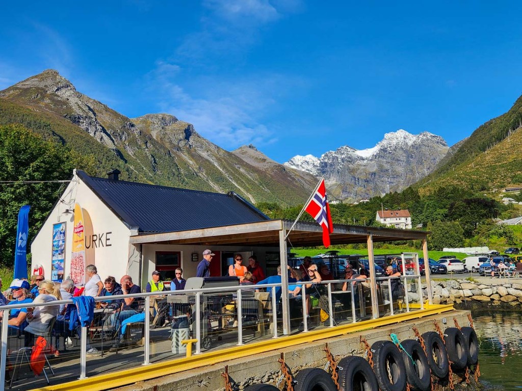 At the dock, there was a little pub with outdoor seating, and it was full and lively. We learned later that almost everyone there had participated in a race up the local mountain peak, Sunnmørsalpene, and back.