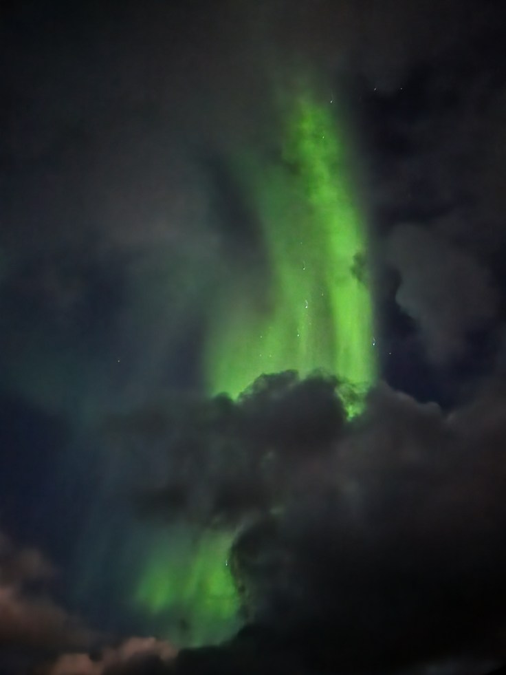 Our ship’s crew had been trying to ensure we had a chance to see the northern lights, and called everyone up to see them late one night. (We could leave our in-room speaker on if we didn’t want to miss the call, no matter what time it occurred.) We had both only seen this phenomenon once, briefly, in Calgary, and that time I could see the colours from the car window. This time, it was a little disappointing for me, since I could sort of make out waves or odd light formations, but the colours didn’t appear unless I looked at them through the lens of my phone camera. We were on a moving ship and I didn’t come prepared for long-exposure night photography, but I was still able to capture a bit of what we saw (or, rather, didn’t see).