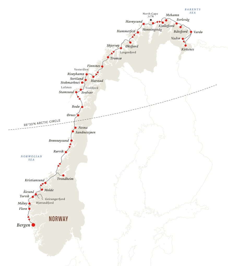 Though we had touched on Norway before, visiting Oslo for a day as part of a Baltic Cruise, we wanted to see the coastal fjords. As we researched how best to see this part of Norway, we came across Hurtigruten’s Coastal Express – North voyage. Our ship, the Nordkapp, with a maximum capacity of 590 passengers, stopped at over 30 ports during the seven days (six nights) we travelled from Bergen on the southwest coast to Kirkenes on the north coast.