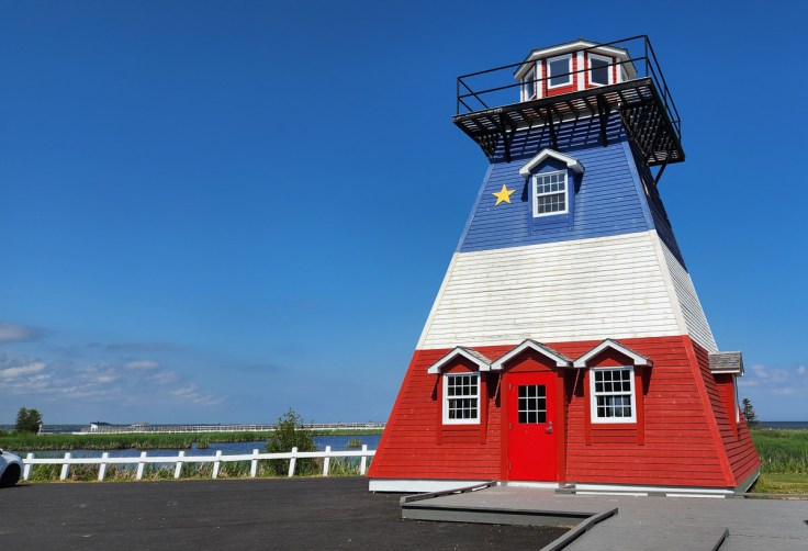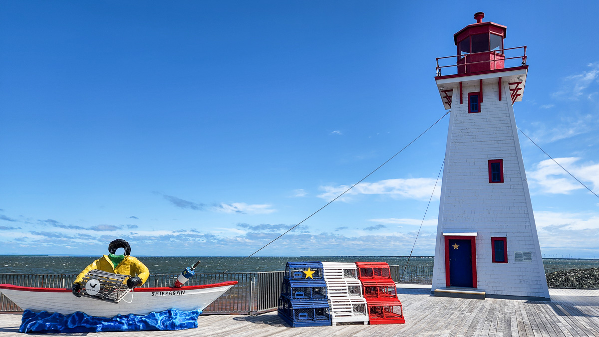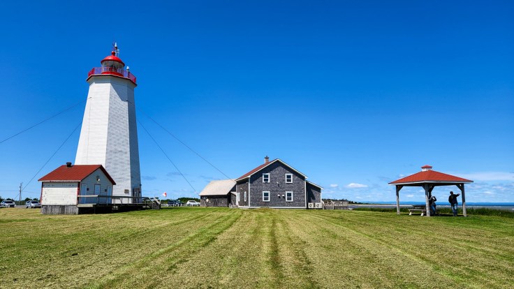 On our way out of Moncton, we visited our autumn housesit hosts, and then drove north to the Acadian Peninsula. So many lighthouses. So much red, white, and blue (Acadian colours). And so much French. We had noticed quite a lot of French in Moncton, both in bilingual signage and francophone conversation. On the southeastern shore of the Acadian Peninsula, though, we were completely immersed in the Acadian culture. It probably shouldn’t have caught us unaware, but it was a delightful surprise. This was also the beginning of the ubiquitous lighthouse–functional or decommissioned, real or ornamental, at the water’s edge or gracing the entry to a mall, full size or trinket. The Atlantic Provinces love their lighthouses.