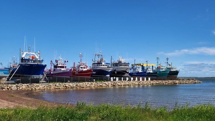 We stayed for a couple of nights part-way up the peninsula’s southeastern coast in Tracadie-Sheila and explored from there, driving across several bridges to the Miscou Lighthouse at the very tip. We stopped for a quick visit in Sainte-Cecilia to see the Sainte-Cecilia Catholic Church (understandably dubbed the Candy Church), which was repainted in 1968-69 from a dreary brown to a surprising pastel kalaidescope. We stopped in Miscou Harbour at La Terrasse à Steve for lunch, and then found ourselves entertained by the fishing boats dancing in the bay as they waited their turn to unload crates of lobster.