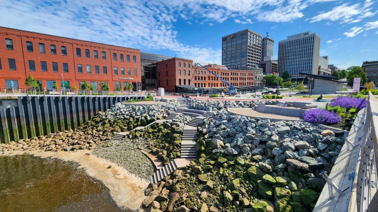Saint John is a hilly town densely filled with historic brick buildings and stately homes. The city wraps around a working port, so we could view freighters, cruise ships and naval vessels from many vantage points. Saint John has done a lot of infrastruture work to build a more pedestrian friendly waterfront with boardwalks, parks, restaurants and gathering spaces along the water’s edge. You can walk on pathways from town all the way to the Reversing Falls, where the Bay of Fundy and the Saint John River meet.