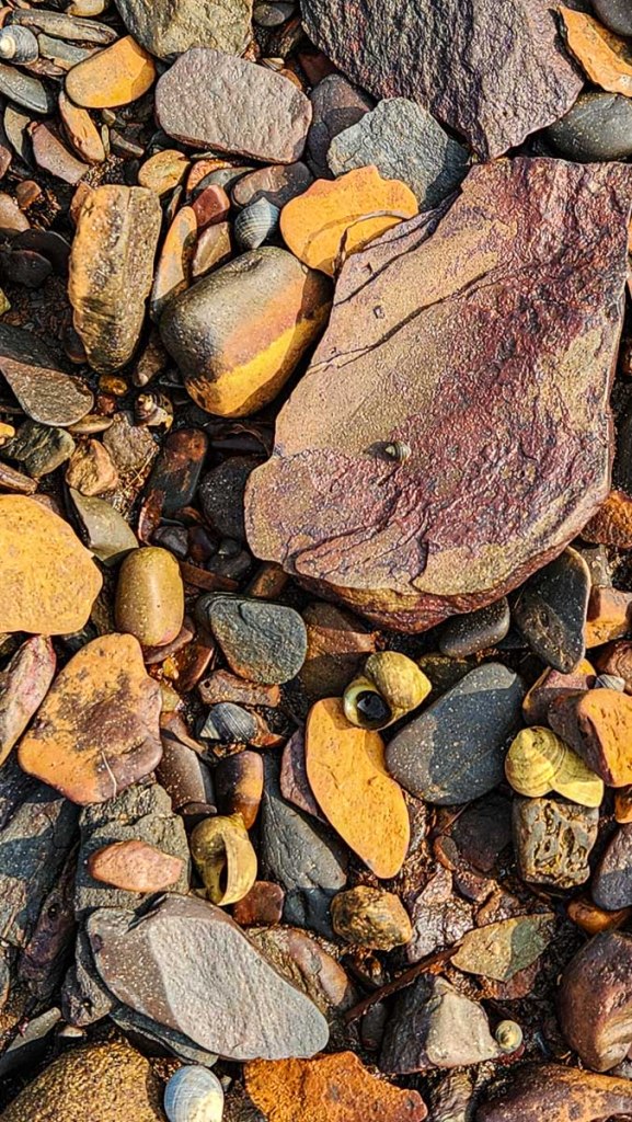 This colourful Rose Bay beach was right at the end of our driveway. As we drove around to other beaches, we regularly saw the strikingly bright yellow of this seaweed (possibly Rockweed?) along some shorelines. On this particular beach, the rocks seemed to mirror the colours of the seaweed.