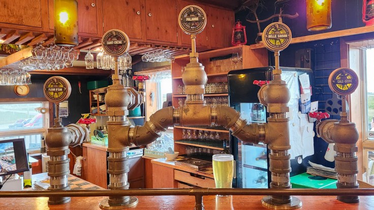 The west side of Cap-aux-Meules offered quite a different environment with its red cliffs and the colourful historic buildings at Site de la Côte, now an arts and culture community. When we visited there were kites flying and an art festival that involved artists producing complete paintings out on the grounds while visitors observed their process. A little farther south is À l’abri de la Tempête, a microbrewery and pub with awesome views.